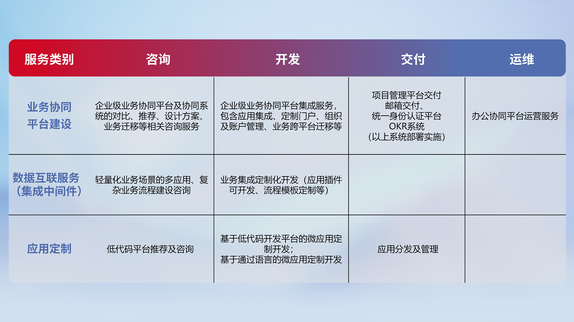 针对钉钉、、企微、、、、IDaas等平台级产品提供产品的规划、、、方案、、交付、、定制化开发等服务,,,实现如统一协同办公、、、、智能客户服务、、、混合会议管理、、、智能数据查询、、、等业务场景,,,实现数字化转型。。。。