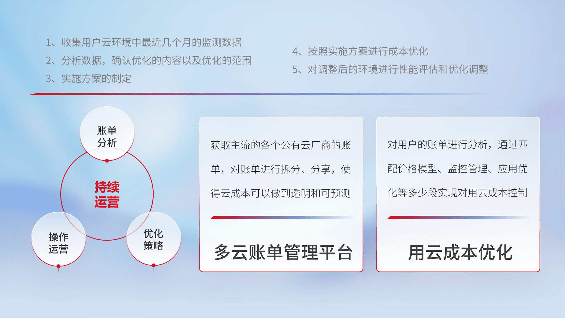 通过多云纳管,,,,以统一的资源数据模型把客户的云资源进行抽象和封装,,,进而实现对多云资源的统一操作,,,保障云资源管理的可靠性、、、稳定性与可用性。。量身定制化运维内容,,,,配置、、、开发运维、、、、补丁管理、、备份、、、监控、、认证和访问管理、、、、审计和日常巡检等,,保障在用云过程中的可靠度,,,,稳定度以及高可用率。。。